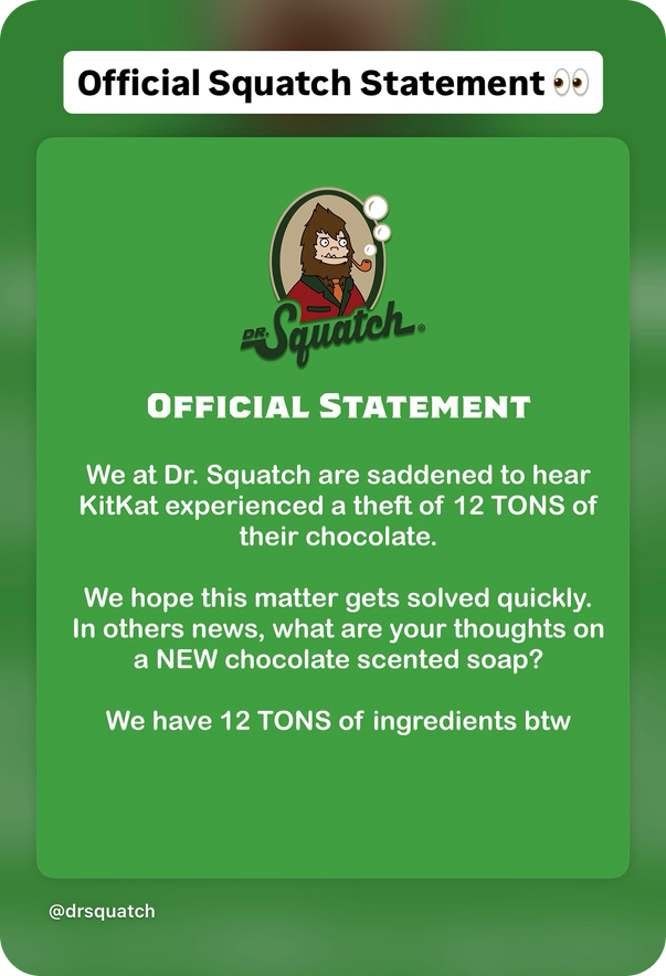 The Concept Born from a viral moment, this project is a rapid-response design concept inspired by the "Official Squatch Statement" regarding Kit Kat’s missing 12 tons of chocolate. If Dr. Squatch "found" the ingredients, this is how they’d use them