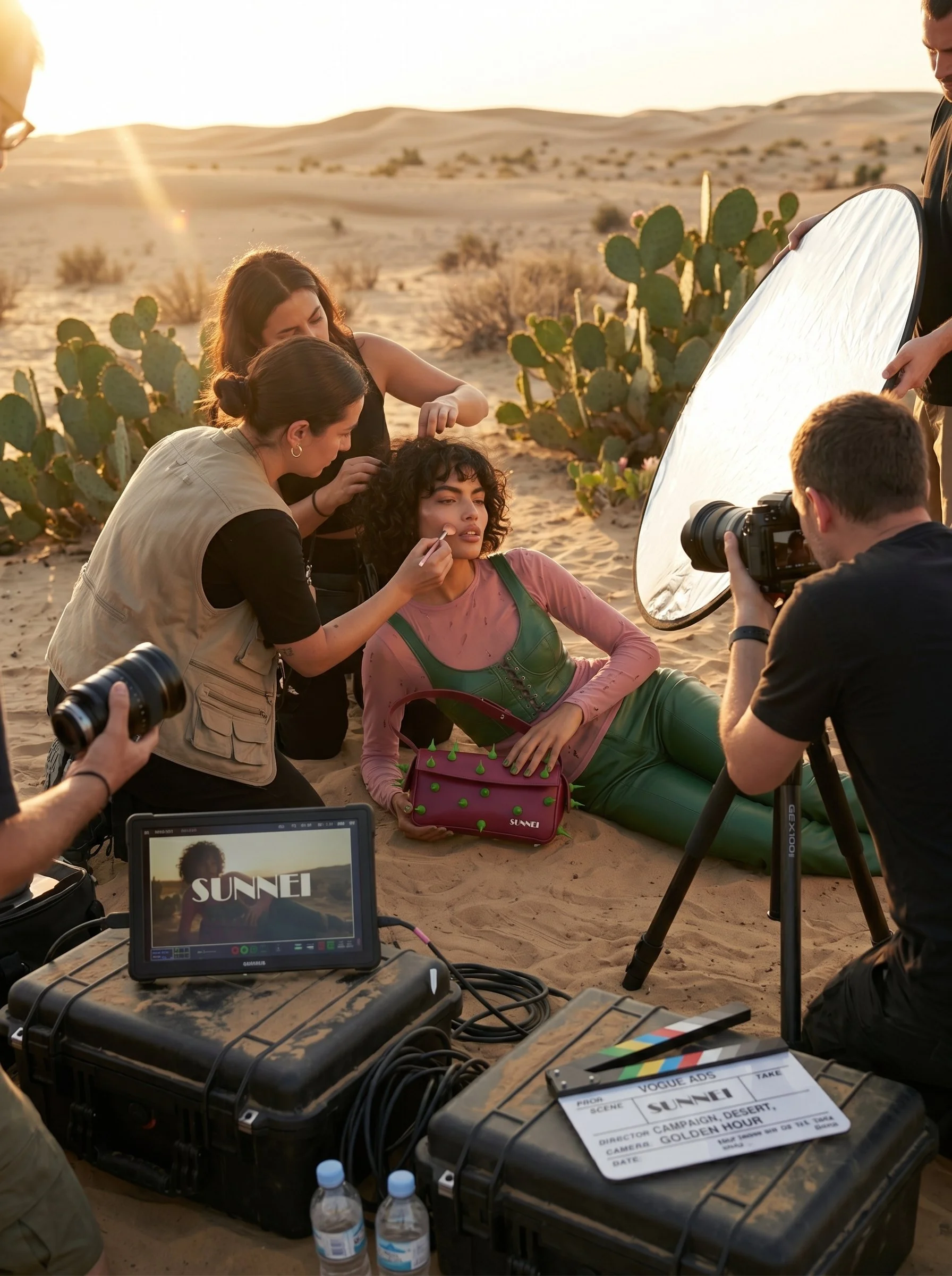 Desert environments were constructed as AI-generated backdrops: cracked earth, towering saguaro, golden-hour dust, and prickly pear fields. Each scene was selected and refined to amplify the bag's spiky character and create visual storytelling continuity across the campaign.